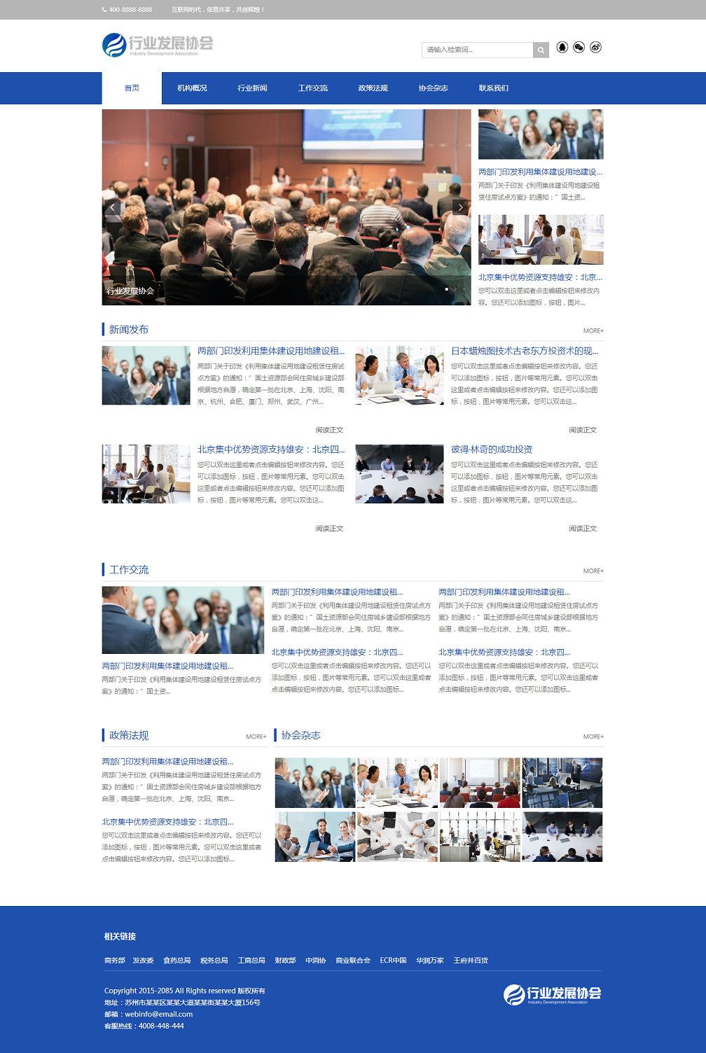 3、功能板块包括机构介绍、行业新闻、工作交流、政策法规、协会杂志、联系我们等。